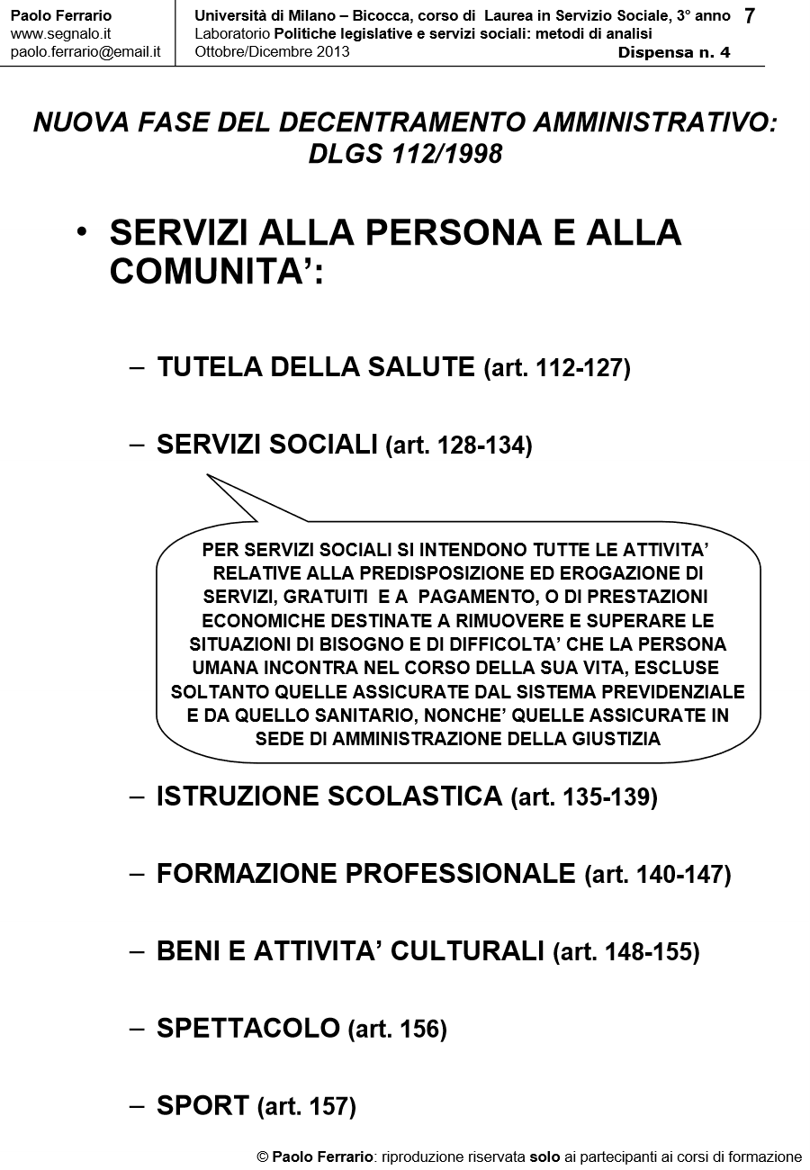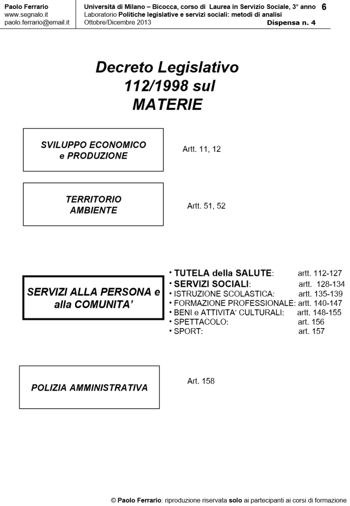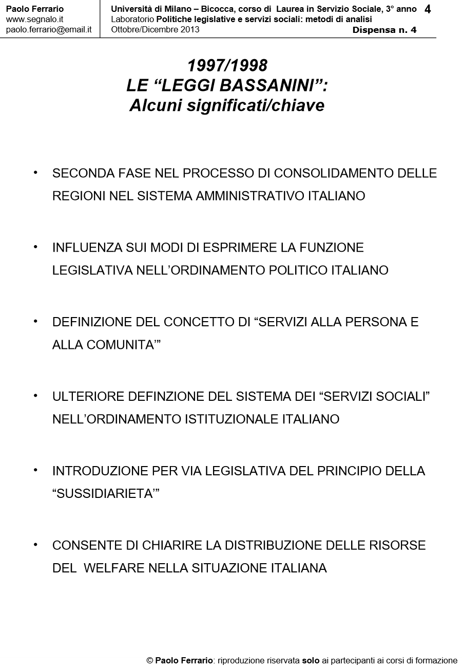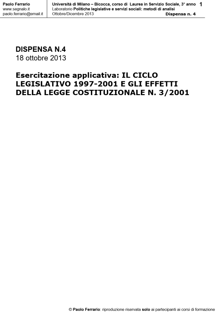 Il ciclo legislativo 1997/2001 e gli effetti della Riforma Costituzionale n. 3/2001, in Laboratorio POLITICHE LEGISLATIVE E SERVIZI SOCIALI: METODI DI ANALISI. DISPENSA DIDATTICA n. 4, a cura di Paolo Ferrario, 18 Ottobre 2013