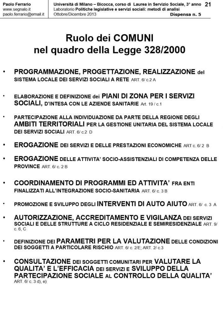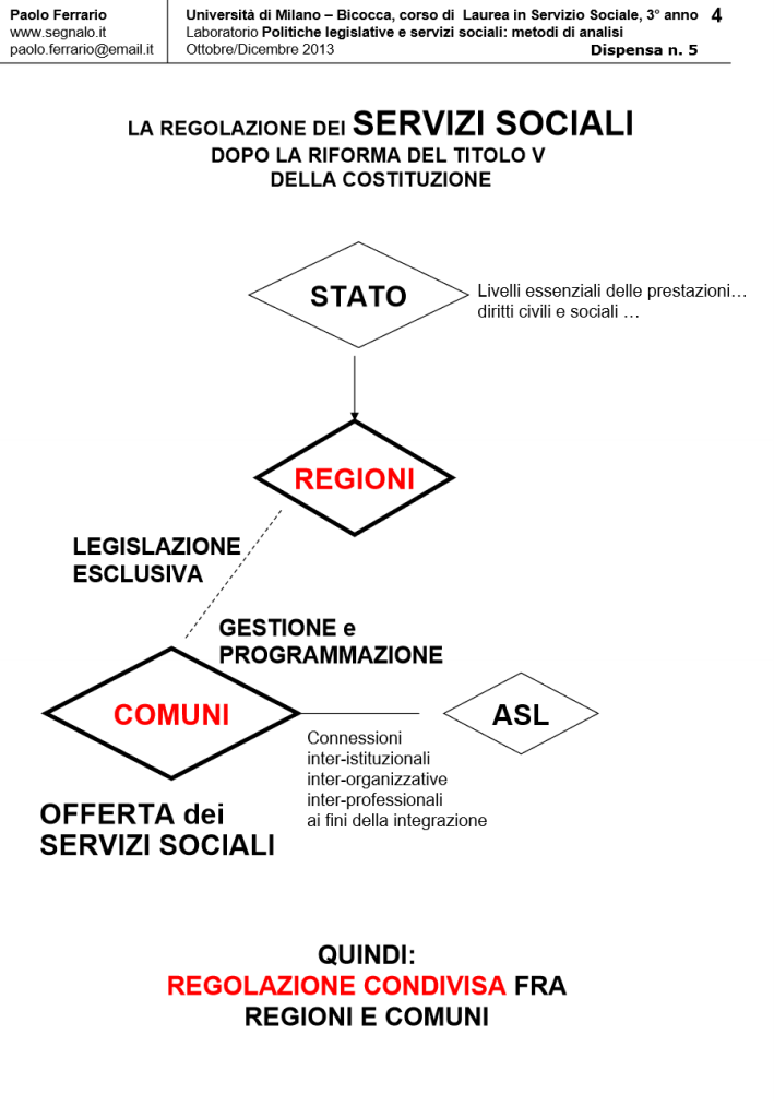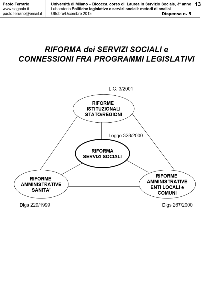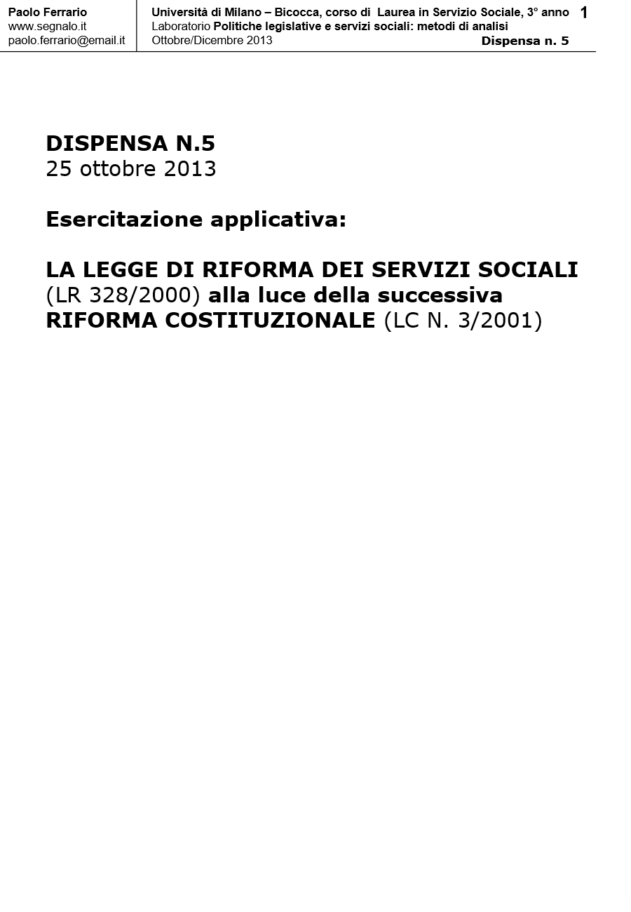 LA LEGGE DI RIFORMA DEI SERVIZI SOCIALI (LR 328/2000) alla luce della successiva RIFORMA COSTITUZIONALE (LC N. 3/2001), in Laboratorio POLITICHE LEGISLATIVE E SERVIZI SOCIALI: METODI DI ANALISI. DISPENSA DIDATTICA n. 5, a cura di Paolo Ferrario, 18 Ottobre 2013