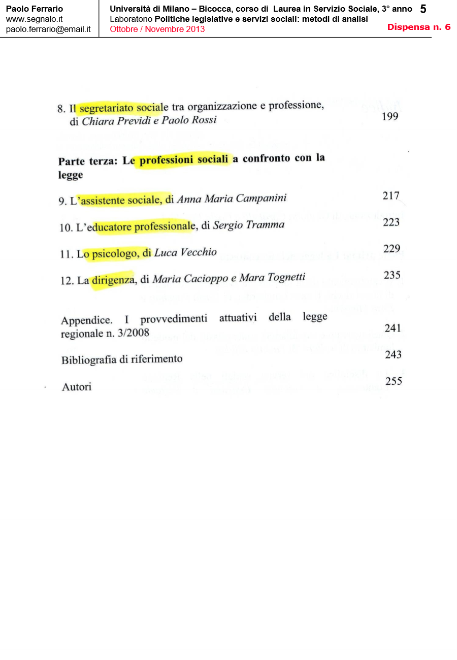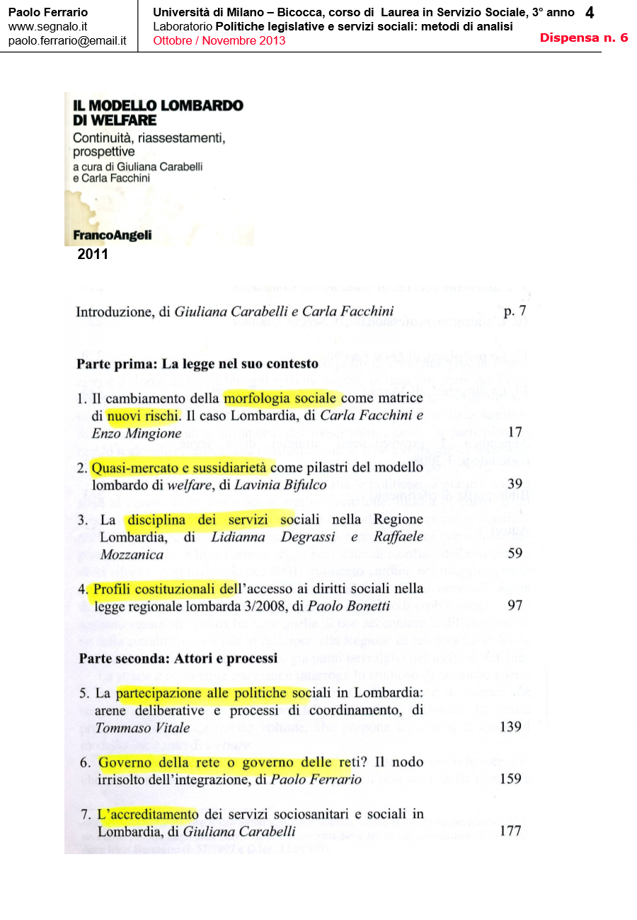 Aggiornamento bibliografico e documentale dei 18 capitoli del libro: Paolo Ferrario, POLITICHE SOCIALI e SERVIZI. Metodi di analisi e regole istituzionali, Carocci Faber editore/collana servizio sociale