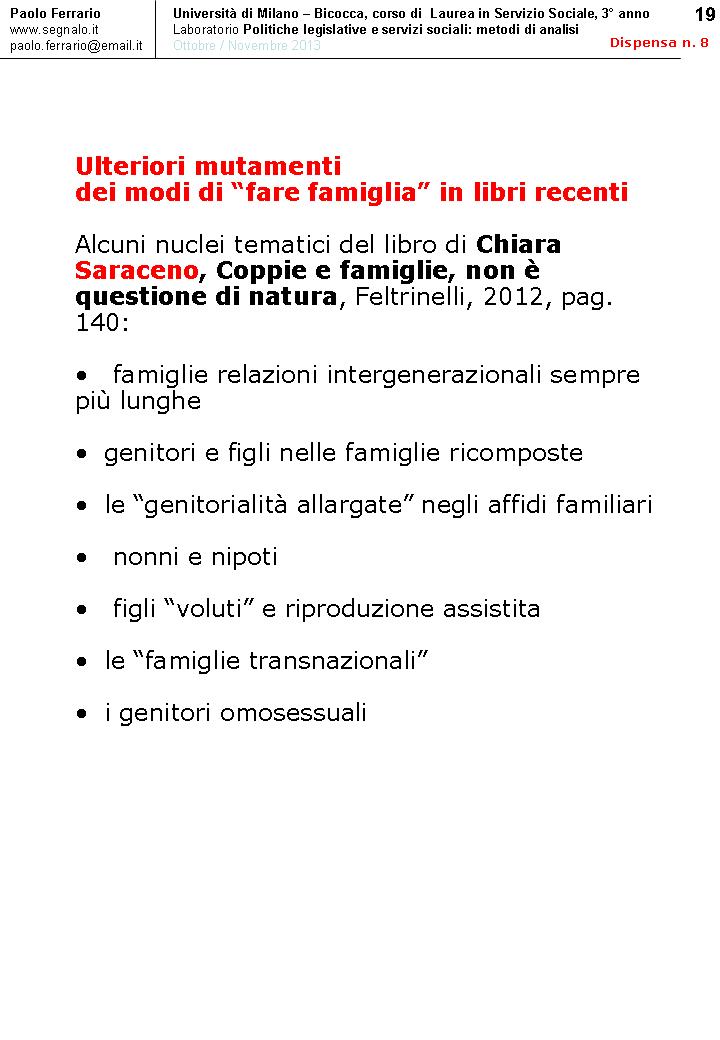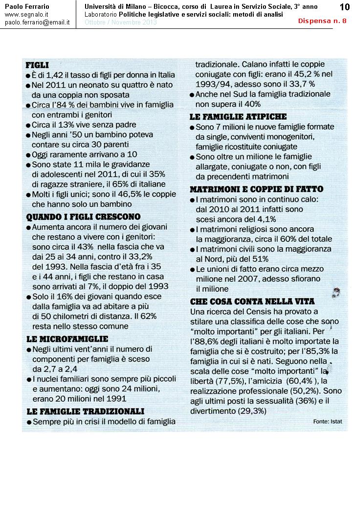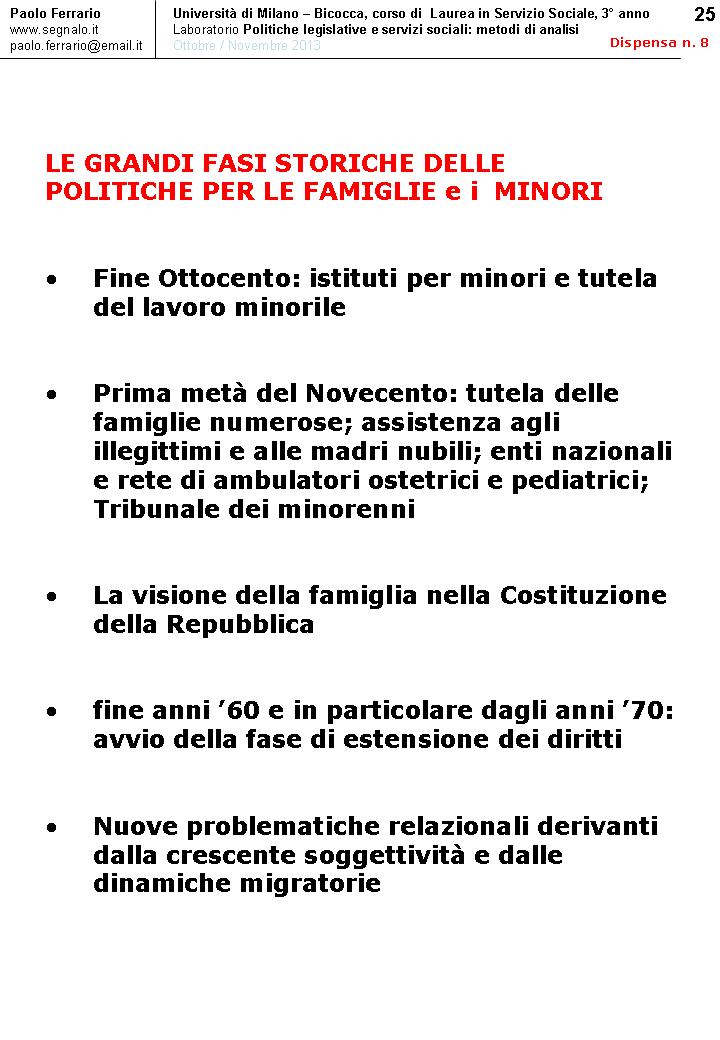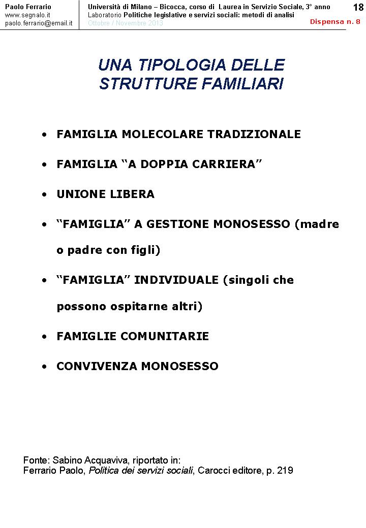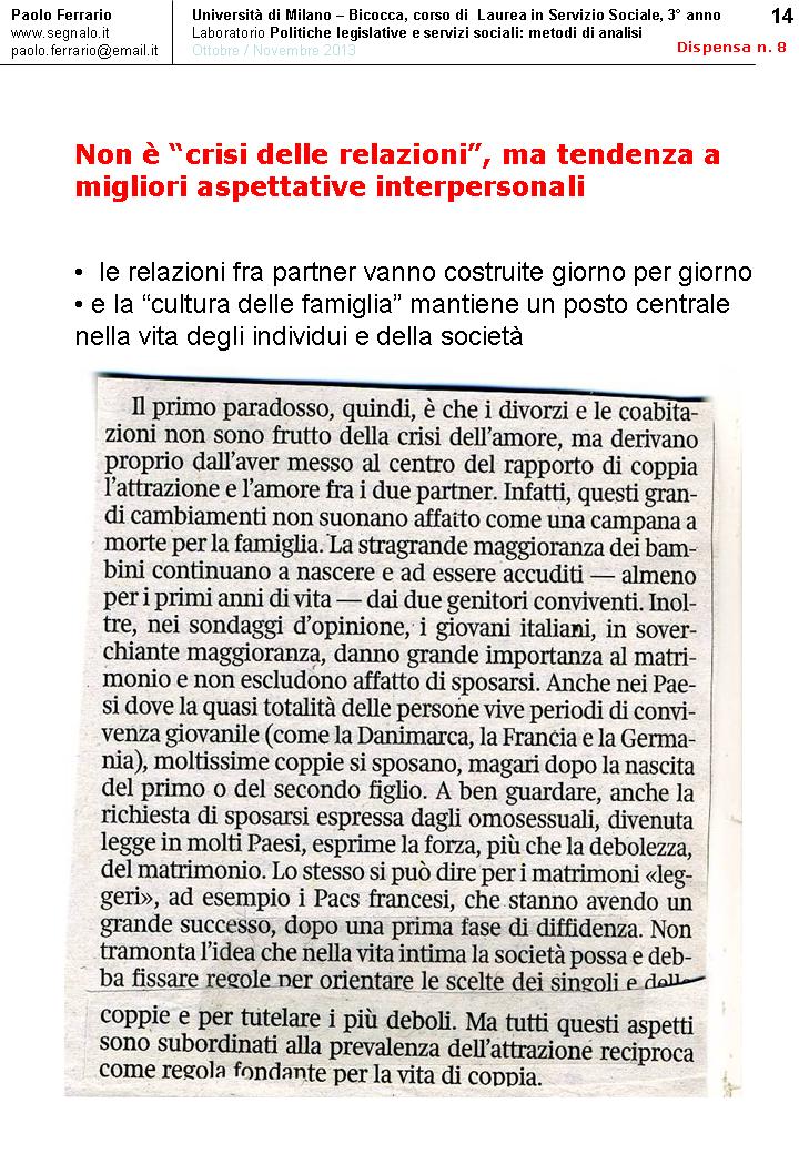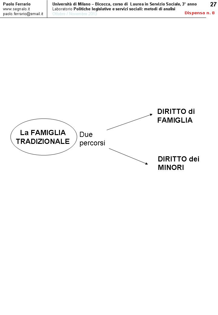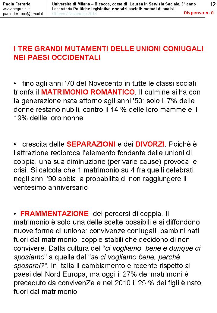POLITICHE LEGISLATIVE PER LE COPPIE, LE FAMIGLIE E I MINORI: mutamenti socioculturali e regole legislative nel corso del tempo storico, dispensa didattica all’interno del Laboratorio Politiche legislative e servizi sociali: metodi di analisi, Università di Milano Bicocca/Laurea in Servizio Sociale, 22 novembre 2013