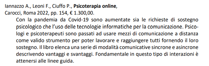 Iannazzo A., Leoni F., Ciuffo P., Psicoterapia online, Carocci, 2022